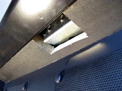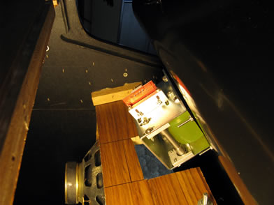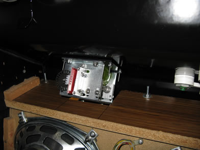 Here, the control panel is fully closed. Looking upward at the underside of the control panel, you can see how the roller controller frame dips below the top inside surface of the wood. This open hole can be easily covered with a simple sheet metal plate. I'll take care of this later.