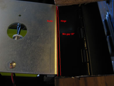 With respect to roller placement vertically on the panel, be aware that it can't be set too low under the "<MOVE>" text because of the following minimum gap requirement. As the panel swings open, the roller gets pretty close to the front edge of the hinge plate. If you position the roller too low (too toward the front face of the control panel), it will collide with the hinge and prevent the panel from opening all the way.