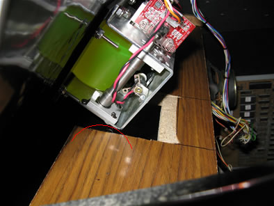 Here's is another view with the approximate arc of rotation marked. Inside the arc, the wood would not have to be cut. Outside of the arc where it dives into the wood, you would have to cut it. In theory, it may be possible to carve out wood from the top side and not go all the way through the wood panel and so eliminate the need for a metal plate cover to be added to the underside. Maybe a small hand router could accomplish such a fancy cut or maybe you could use a standard router to notch it out if you can remove the wood panel for cutting it and then replace it. I think it's a lot easier to just cut out the entire section and cover it underneath with a metal plate later. Obviously personal choice applies here.