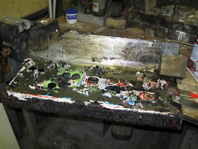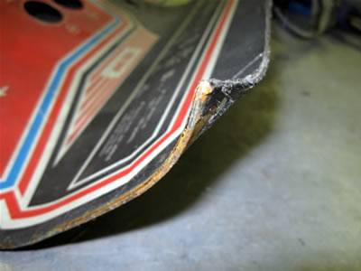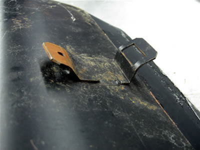 There were a few little problems, a bent corner and bent hold-down brackets. After removing the overlay, adhesive, and the paint, I fixed these parts by heating them with a torch and tapping them back into shape using a small hammer.