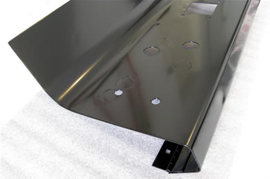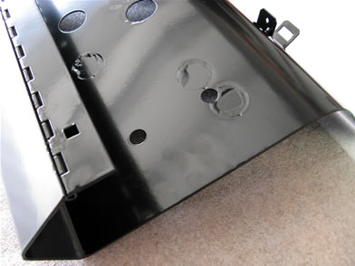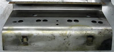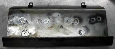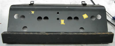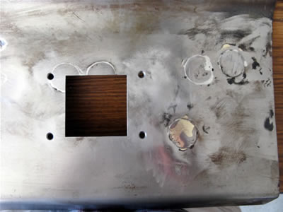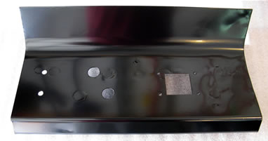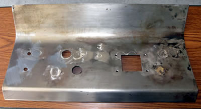 At this stage, I glass-bead-blasted the entire panel. After about 15 minutes in the blasting chamber, the entire panel was silver and had a satin finish. The lightly abraided surface improves paint or powdercoating adhesion. All of the blackened and dirty looking areas seen in the above pictures became completely clean and shiny and ready for paint. Sorry, I didn't have a chance to take pictures of the blaster chamber or the panel after it was done. I took it straight to the powdercoat company before it had a chance to rust.