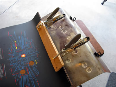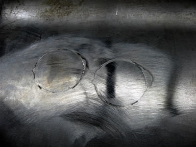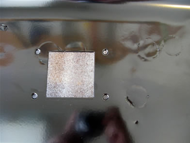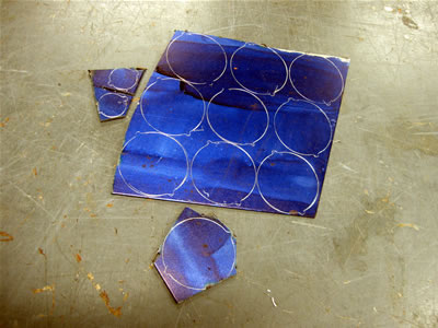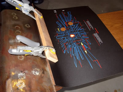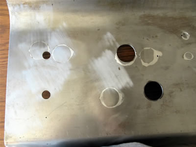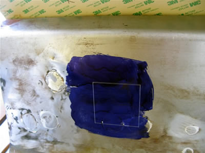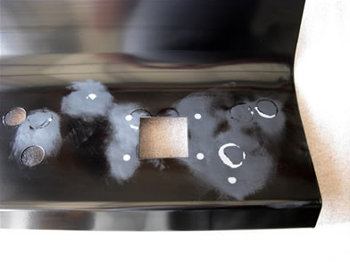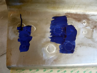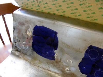 Apply Dykem Steel Blue dye to the steel panel in the areas where the holes will have to be cut. This picture shows the holes already scribed because I took this picture after the next step.