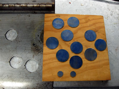 First, I had to make 12 sheet metal disks, two small ones for the player-start button holes and ten of the large ones to fill the gameplay button holes. Anyone have a CNC waterjet in their pocket? Me neither. I coated a piece of sheet steel with Dykem Steel Blue and then scribed the circles using the panel itself as a template. I then separated the disks using a bandsaw.