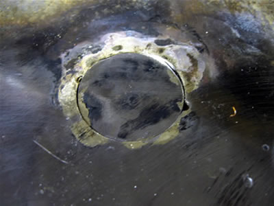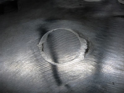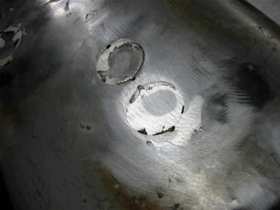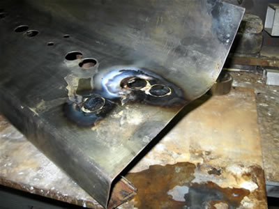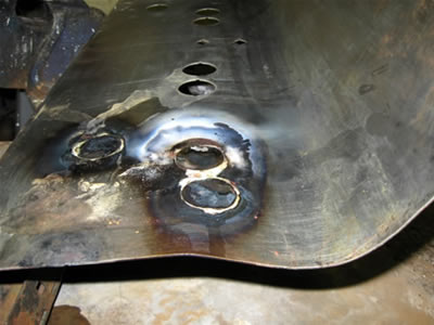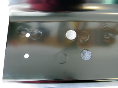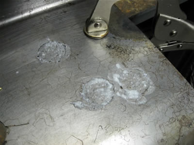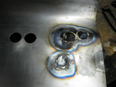 MIG Weld? My first attempt was to tack them in place using a MIG welder. I had not welded anything in about 25 years so I decided to practice on some scrap pieces of sheet metal. Let me say simply that it didn't turn out quite the way I expected it to. That said, I still think that someone who is really good at MIG welding could make short work of installing the disks without wrecking the panel and if so, this would certainly be the best method to use.