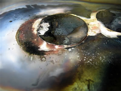 Three large disks sitting in place (there's a flat steel plate underneath) with flux applied...