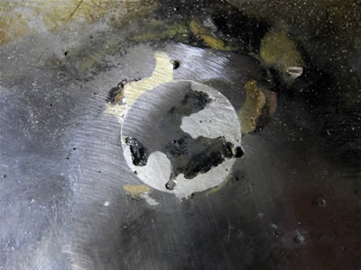 It's probably no surprise to most people that the easiest method of securing the disks in the holes would end up being the one requiring the lowest temperature, that is, for people like me who can't weld to save his life. The temperature required for soldering is roughly 700°F to 800°F (371°C to 427°C). I used lead-free electronics solder, specifically Sn/Au/Cu (tin / silver / copper). I chose this solder because it has a higher melting temperature than tin/lead solder and because it produces a stiffer and stronger bond that is also more resistant to fracturing under stress. The strength of solder wire cannot compare to that of brazing wire but soldering can be done using a simple propane torch. I soldered my panel using an oxy-acetylene turned down as low as I could get it.