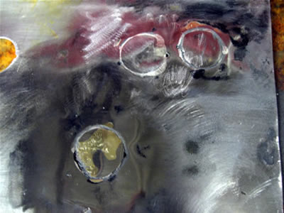 The result was a nightmare as you can see. I thought for sure that I had trashed this panel. Look closely at the disk in the 4'th picture. It's raised by at least 1 mm. This happened because the brazing material flowed underneath the disk and lifted it up. I would've been smarter to weigh it down on one side using a steel block and brazing the opposite side, then switching the block around to do the second side. The point is moot however considering that the entire panel went wild.