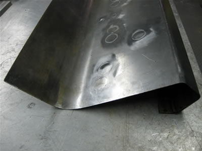 Braze? Moving on, I decided to try brazing using an oxy-acetylene torch and brazing wire. Again, I practiced first on a couple of flat scrap pieces. The results were impressive and encouraging so I decided to try it on the actual panel...