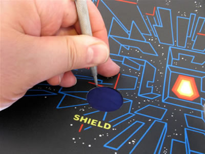 Now that the entire control panel has been filled, it's time to cut the new holes required for the player-start and gameplay buttons and the fancy schmancy roller controller. The trick is figuring out where to mark the hole locations on panel so that the new CPO will line up exactly over the holes. Here's how I did it.