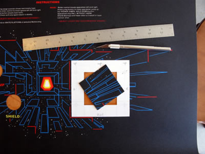To install the CPO, do not remove the backing at first. Line it up on the panel and install the buttons just tight even to allow the CPO to be moved under them a little bit. Move the CPO around as required to perfectly line up the square hole with the square hole in the panel. Apply masking tape very tightly around the square hole to secure it all the way around flat againt the panel. Apply masking tape at both ends of the panel adjacent to the player-start buttons and at the same height on the other end as well.