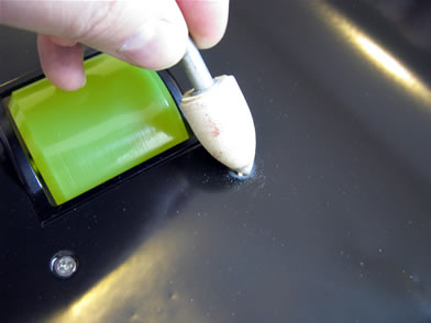 Next, prepare the holes for the J-B Weld epoxy. It's a good idea to rough up the surface of the powdercoat inside the countersunk area of each hole. This will improve adhesion of the epoxy and make the screw a lot less likely to break free at any time after the CPO is installed. You should work on one screw/hole at a time so that the roller controller never moves from its nominal position. Very lightly and carefully sand the surface a bit around the taper of each hole. I used a grinding stone and just turned it a few times by hand and then wiped off the dust with a lintfree cloth.