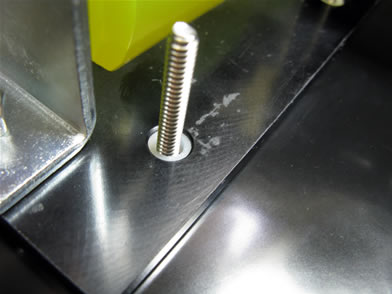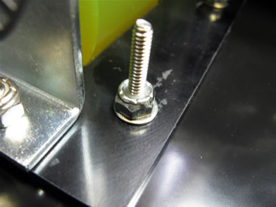 To retain each of the 4 screws in the final installation of the roller controller, use a number 8 flat washer and a nylon-insert locknut. Make the nuts just lightly snug. Do not over-tighten them as this would provide no extra benefit and it might break the epoxy (later on after the cpo is installed) and then you would have no way to fix it. For the temporary purpose of installing the mounting screws however, use a normal plain non-locking nut instead because it will be a lot easier to work with for now. Now go ahead and install all 4 screws with washers and nuts to be 100% sure that the roller controller fits properly.