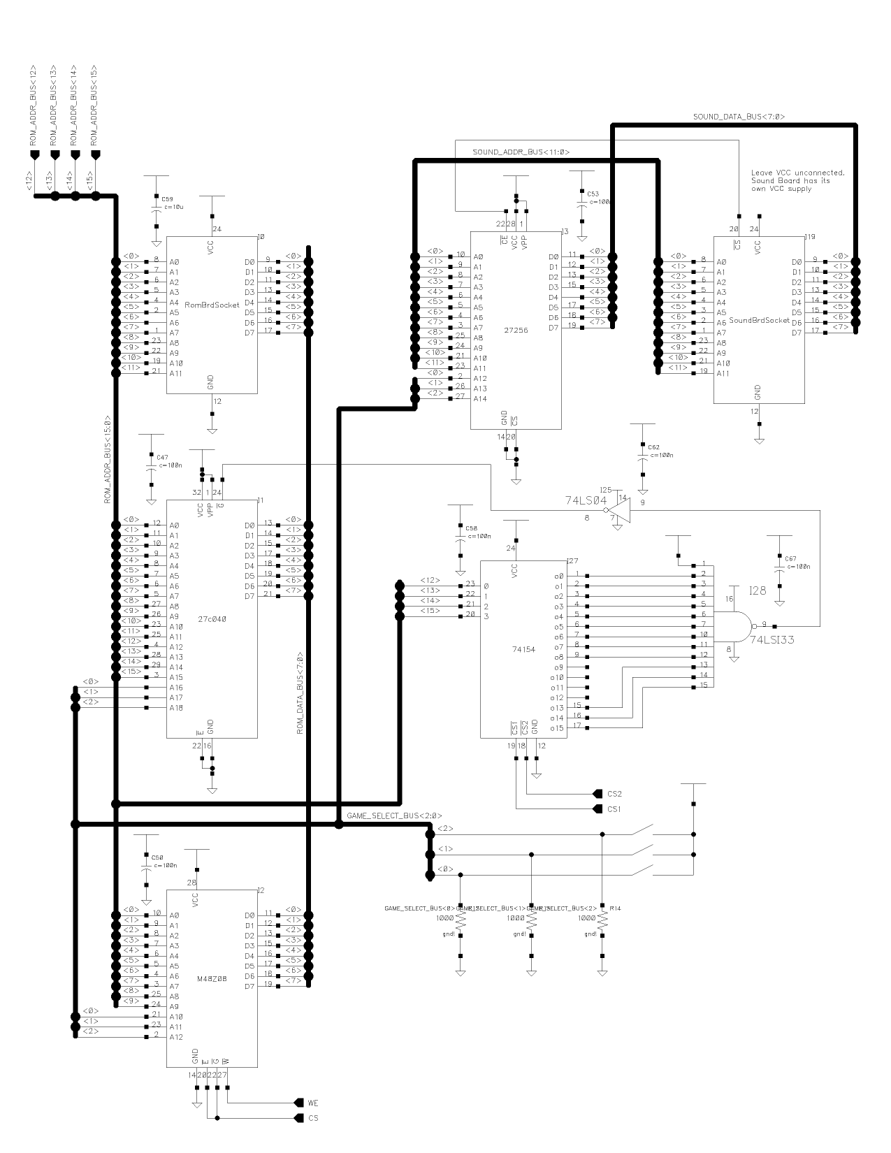 This hack is a middle ground between Doug's version and Sean's version. This hack combines Doug's all-in-one-ROM hack and his Bubbles hack onto one daughtercard and reduces the number of added wires slightly. It also adds a DIP switch selection and independent CMOS banks for each of the games. This hack does nothing about the control panel. I just switch plugs on mine when I flip the DIP switches. This hack won't give you Defender or Sinistar. They require changes to the memory map that are beyond the scope of this hack. Besides, Sinistar needs a vertical tube and Defender is just a simpler version of Stargate. This hack also makes few permanent modifications to the original boards. As these games start to officially become antiques, a collector should also begin thinking about being a conservator. If all we wanted was to just play the games, we could play them on our PCs, after all. There are two changes that have to be made, however: The original CMOS chip on the CPU/vid board must be disabled. There are two ways to do this. The better method is to desolder and remove the CMOS chip and replace it with an IC socket. This makes the hack more reversable. To reverse the hack, just stick the chip back in the socket. The other alternative is to cut the /CS trace leading to this chip. To undo this, you'll need to reconnect the trace. The trace in question is the one leading to pin 8. The CMOS RAM chip is at 1C on the board. Pin 10 is the /WE pin. You don't need to cut this pin, as we don't really care what is written into this chip anymore, since we'll never read from it (besides, both /CS and /WE have to be asserted to write). Since you've disabled the CMOS chip, you can also remove and throw away the AA batteries on the CPU/vid board. They won't be used anymore. The other change that is necessary is removing and bypassing the 7805 on the sound board. The reason for this is that the daughtercard ties into the 5 volt supplies from both the ROM board and from the sound board. If the 7805 were left in place, then the result would be two 5 volt power supplies fighting with each other to power the whole system. This leads to large currents through the daughtercard and possibly ripple or other problems with the +5 supply on one of the boards. The best way to handle this situation is to desolder and remove the 7805 from the sound board and run a wire between one of the unused power input pins and test point 4. Then punch down a new wire on the power connector to match the pin you connected to TP4 and connect the wire to the +5 volt supply at some convenient point. You should use a relatively beefy wire for both this and the TP4 jumper -- 24 gague or better. You don't have to modify the soundboard if you don't want to. The other option is to keep the 5 volt supplies separate -- Connect pin 24 from the sound board ribbon cable to pin 28 of the 27512, but nowhere else, and use a separate set of DIP switches to control the sound board ROM. By keeping the 5 volt supplies separate you should be safe from the problem of fighting power supplies. Next, carefully remove the ROMs from your ROM board. Not only are you going to want to save them for later, but you (presuming you don't have other means to get Williams ROM images) need to read them in so that you can put the code into the new BIG ROM used on the daughtercard. The daughtercard will contain a 27C040, a 27512, a 74LS04, a 74LS133, a 74154, a M48Z08, 3 DIP switches and two 24 pin sockets that will attach to ribbon cables leading off to the ROM board and the sound board. The circuit is fairly simple. A0-A11 and D0-D7 come in on one of the 24 pin sockets. A12-A15 come in on 4 wires. Two /CS signals come from the 74154 on the ROM board to the one on the daughtercard (which is going to have the same inputs, and will thus 'mirror' the ROM board one). A12-A15 also go to the '154. 12 of the outputs of the 74154 go into the 74LS133 (leave out outputs 9 through 12). The output of the 74LS133 gets inverted by one of the gates in the 74LS04 on the way to becoming the /OE pin of the 27C040. A16-A18 of the '040 go to 3 DIP switches. A0-A9 also go to the M48Z08, as do D0-D7. A10-A12 go to the same DIP switches. /E and /G (tied together) go to the CMOS /CS from the CPU/vid board, and the M48Z08's /W goes to the CMOS chip's /WE signal. Finally, a 2nd 24 pin socket brings in A0-A11 and D0-D7 from the sound board (note that this is a different address space, thus the two separate ROMs on the daughterboard). Those signals as well as the sound board ROM's /CS go to the 27512, and A12-A14 come from the DIP Switches. Now let's look in detail at what's going on. The 74154 on the ROM board is there to choose which of the 12 ROMs should be selected. It does this based on 6 inputs -- two /CS signals and A12-A15. There are 16 outputs of this chip, only 12 of which go to ROMs. We want to select the BIG ROM whenever any of these 12 outputs is chosen. So we want a 12 input inverted-input NOR gate. Well, the 74LS133 is a 13 input NAND gate... Add an inverter at the end and tie one of the inputs high and we're all set! The upper address pins of the '040 act as a game select, choosing which 64K chunk of the ROM is to be present in the address space. It also does this for a 1K chunk of the NVRAM, and a 4K chunk of the sound ROM. My first pass at this was wire-wrapped in a 4"x4" piece of perfboard. The hardest part was finding a supplier of the SGS-Thomson NVRAM chips. I ended up having to buy 10 of them. *sigh* They're interesting little devices, though. I'm sure that you can do something interesting with the other 9 if you're forced to do this as well. One thing I have discovered is that you can't quite just switch games by flipping the DIP switches. At first blush, this conclusion would seem obvious -- changing the DIP switches with the CPU running is bound to scramble things badly. However, just flipping the DIP switches really does work in the case of the main CPU. The CPU will g