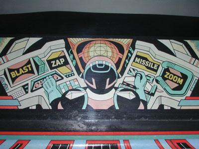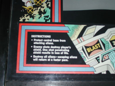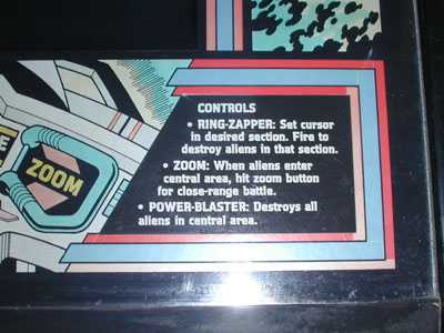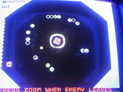 When the enemies get to the center area, an alarm sounds, and you must hit the ZOOM button. This flips you view to a close up of the center area. Here you must defend you ship from the aliens who have made it to the center. Your ship is in the middle with a set of rings that make up your 'shield'. The rings do not rotate, but they can be shot away by the enemies. Typically they enter the center area, take a few shots and then leave to refuel and reload. Then they come back. When they leave the center area, you press the ZOOM button again to bring back the first view. You can pick off the enemies as they are trying to escape.