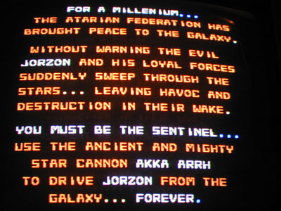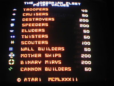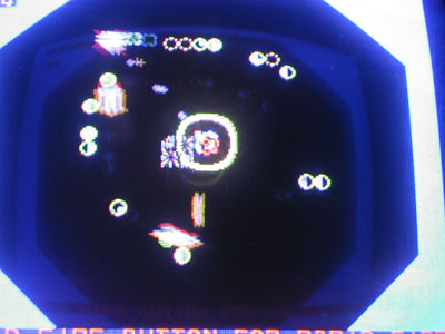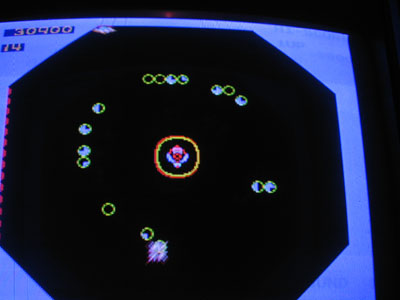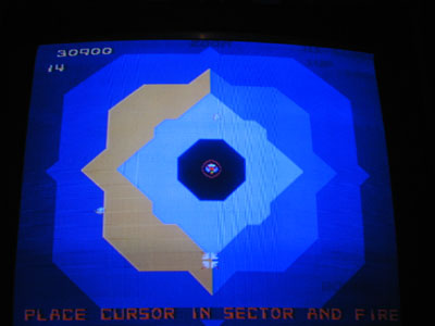 On this screen, you basically aim your pointer over the different colors/sections of the shape. When you shoot, it 'electrifies' that section and kills all the enemies in the section you 'electrify'. 10-30 enemies will come at you at the same time, which makes it tough to kill all of them before they get into the center area.The second screen is the one that looks like Star Castle. (http://www.safestuff.com/aa9.jpg).