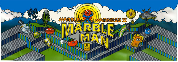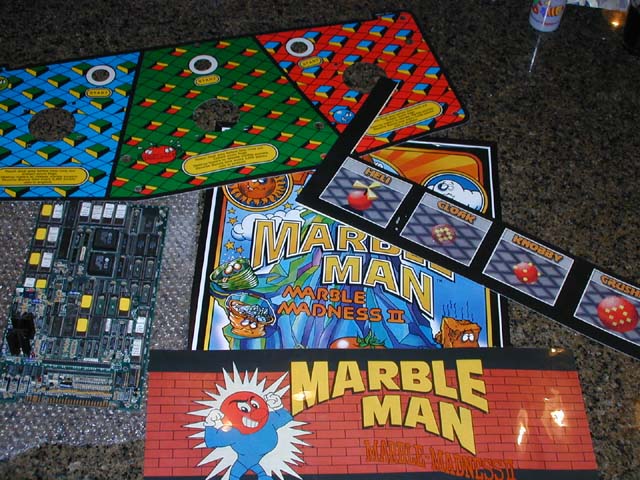 I have aquired a second Marble Man. Here are pictures of all the parts to complete the second machine. I recently won an eBay auction for the second piece of sideart,which is the final piece of the puzzle. Pictured below you will see and NOS control panel overlay, NOS sideart, First Design Marqee, Monitor Bezel and a Working boardset. I am hoping to get the three trackball version running for the 2002 California Extreme show.